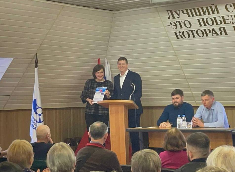 На торжественном собрании заместитель председателя Профсоюза работников АТ и ДХ МО Глушинский Владимир Юрьевич поздравил коллектив с юбилеем и вручил председателю ППО Долгопрудный Кочиевой Диане Викторовне подарок для членов профсоюза.