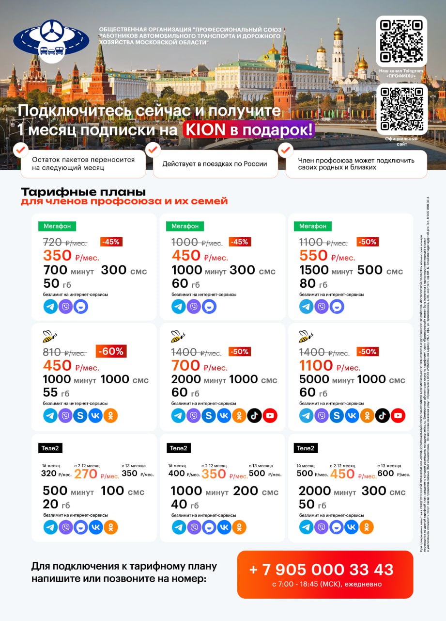 * Перейти на тариф "Профсоюзный" со своим номером можно только у оператора "Билайн" за разовую плату в 500 рублей.