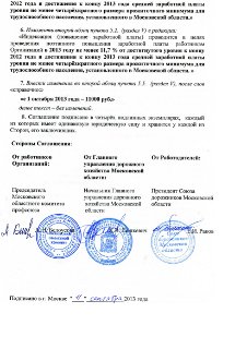 Соглашением предусматривается «поэтапное повышение заработной платы работникам Организаций в 2013 году не менее 11,7% от достигнутого уровня к концу 2012 года и достижение к концу 2013 года средней заработной платы уровня не менее четырёхкратного размера прожиточного минимума для трудоспособного населения, установленного в Московской области. Устанавливается, что минимальным уровнем заработной платы с 1 октября т. г. является заработная плата = 11 тыс. руб. (при соблюдении установленной законодательством продолжительности рабочего времени). Соглашение размещено в разделе НАПРАВЛЕНИЯ ДЕЯТЕЛЬНОСТИ подраздел ЗАЩИТА РАБОТНИКОВ - СОГЛАШЕНИЯ