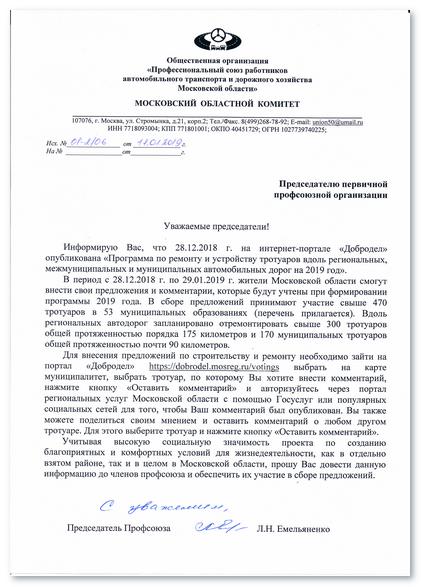 Председателям первичной организации. Информируем Вас, что 28.12.2018 г. на интернет-портале «Добродел» опубликована «Программа по ремонту и устройству тротуаров вдоль региональных, межмуниципальных и муниципальных автомобильных дорог на 2019 год».