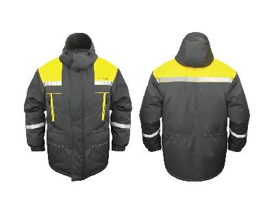 Размерный ряд представлен разными вариантами, согласно типовым мужским и женским фигурам. Фасон - прямой, для женщин - удлиненный. Внутри куртки есть поясной шнурок, что позволяет самостоятельно отрегулировать силуэт. Форменная одежда с вышитым логотипом предприятия выполнена в корпоративных цветах Мострансавто (в желтом и сером), имеет световозвращающие полосы.