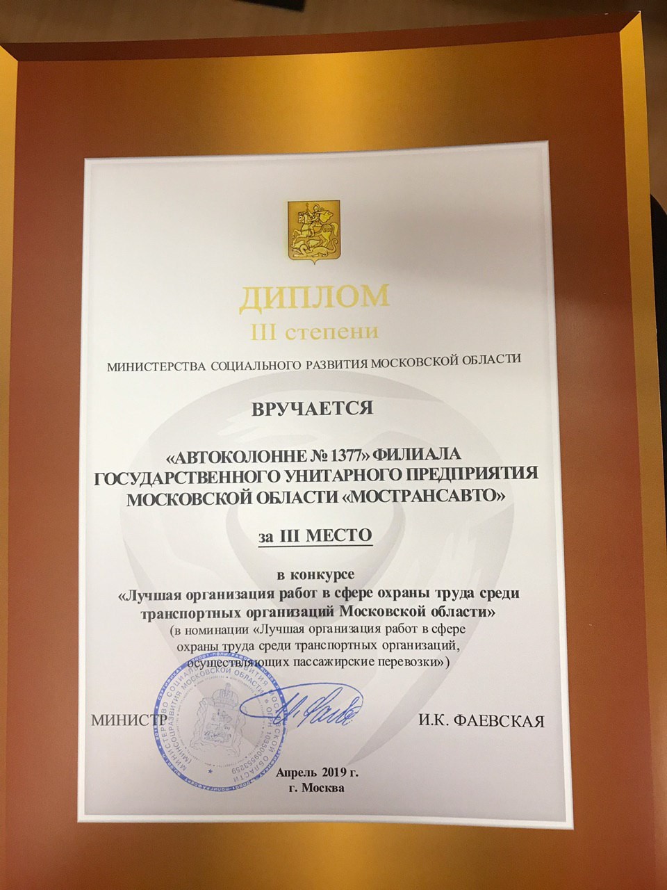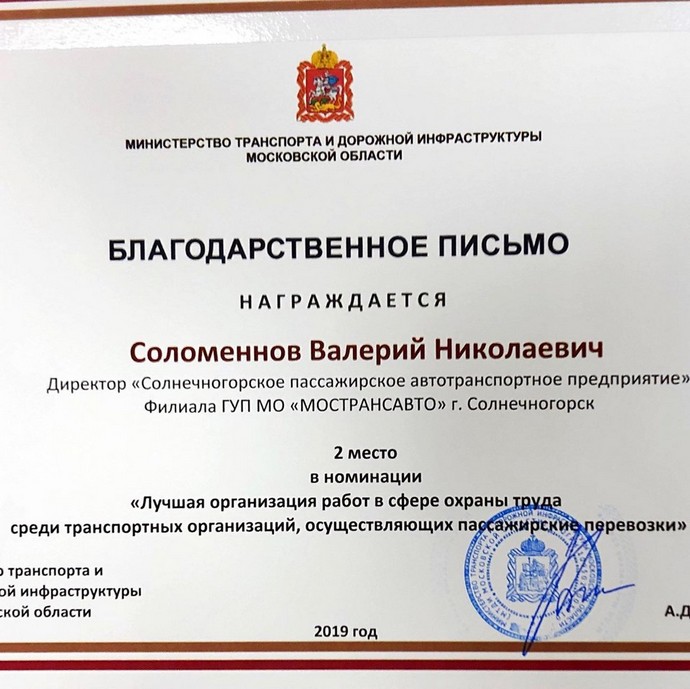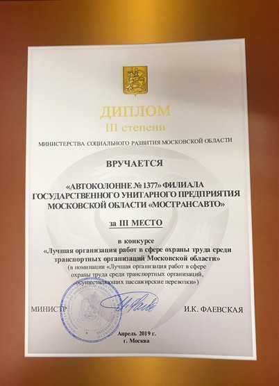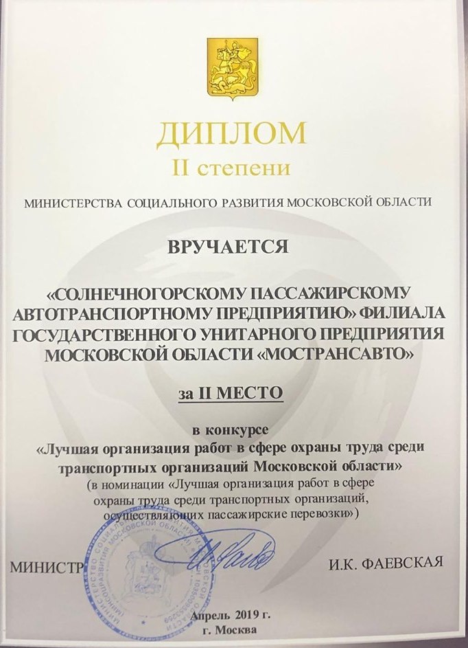 23 мая 2019 года в Министерстве социального развития Московской области состоялась церемония награждения коллективов филиалов ГУП МО "МОСТРАНСАВТО" по итогам Московского областного конкурса "Лучшая организация работ в сфере охраны труда среди транспортных организаций Московской области" в номинации "Лучшая организация работ в сфере охраны труда среди транспортных организаций, осуществляющих пассажирские перевозки":