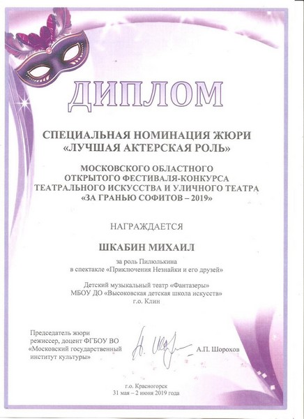 А в завершающий день фестиваля 2 июня они выступили как уличные артисты на открытых площадках фестиваля, показав мюзикл "Приключения Буратино". А в апогее трехдневной феерии, все и артисты, и зрители приняли участие в костюмированном карнавале. Затем состоялась торжественная церемония награждения и закрытия фестиваля. Дети и взрослые увозили из Красногорска в Клин неизгладимые впечатления и специальный приз жюри фестиваля - Диплом в специальной номинации жюри "За лучшую актерскую роль" Пилюлькина в спектакле "Приключение Незнайки и его друзей".
