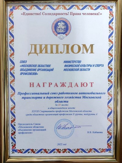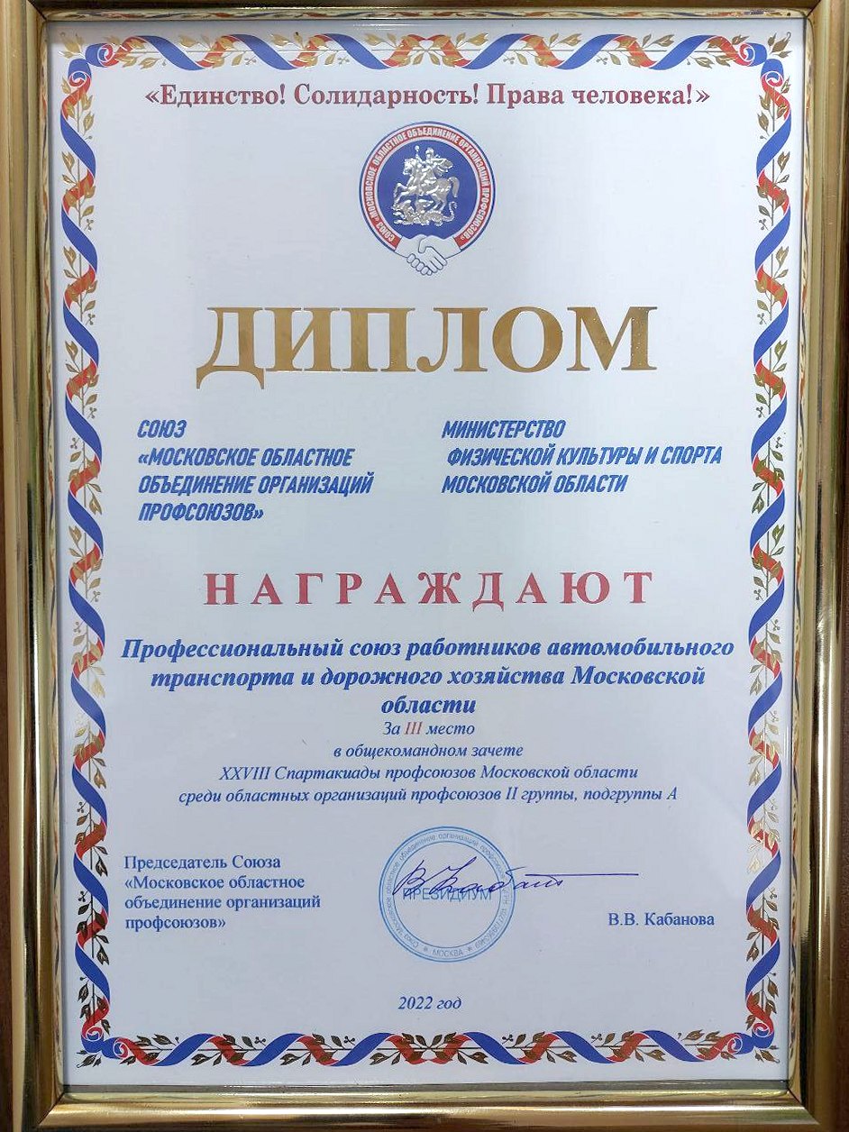 По итогам XXVIII Спартакиады профсоюзов Московской области в 2022 году Профсоюз работников автомобильного транспорта и дорожного хозяйства Московской области занял III место в общекомандном зачете