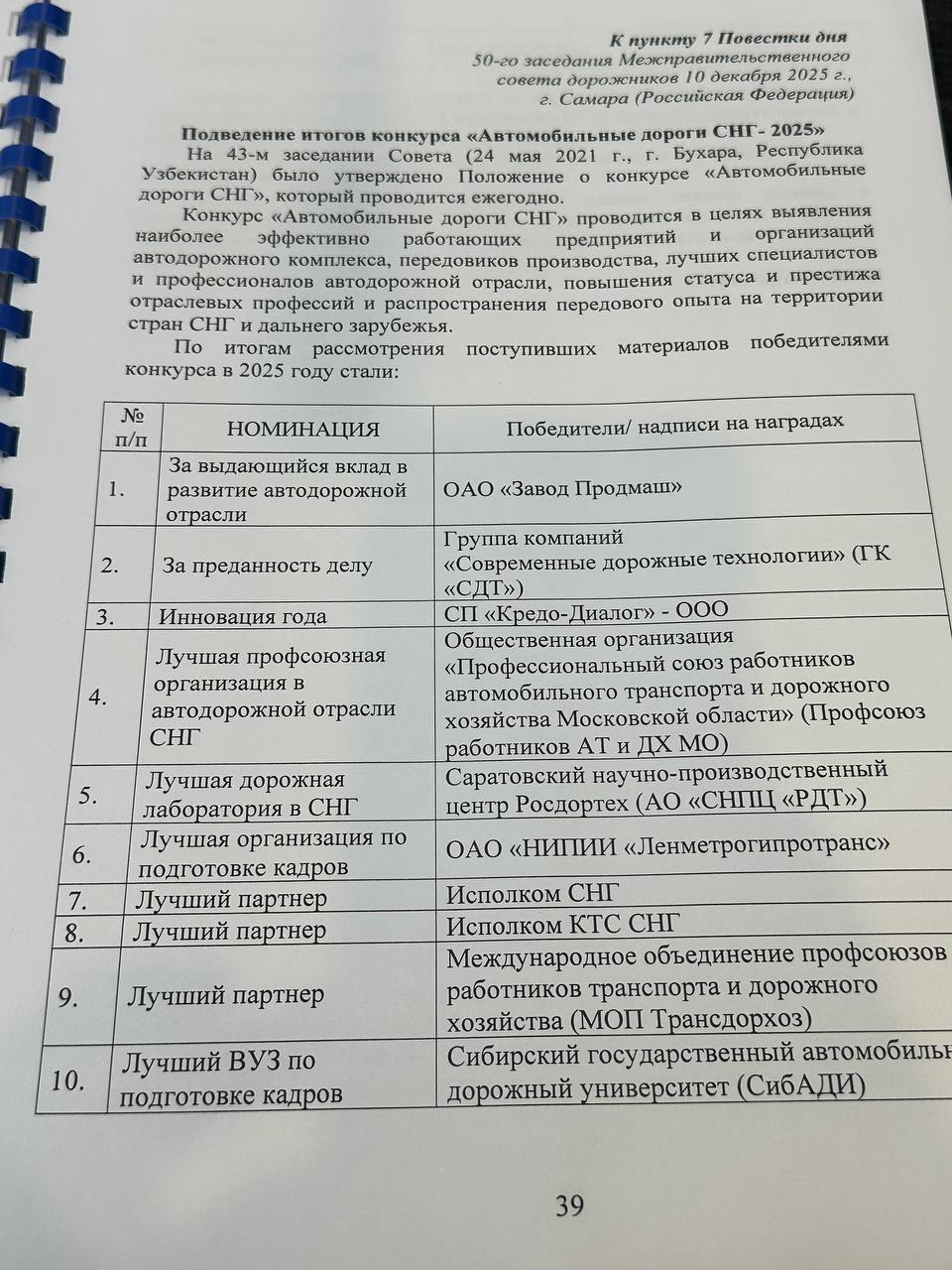 10 декабря 2025 в Самаре состоялось 50-ое заседание межправительственного совета дорожников. Одним из вопросов повестки было подведение итогов конкурса