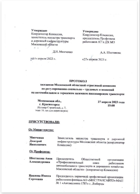 ПРОТОКОЛ заседания Московской областной отраслевой комиссии по регулированию социально – трудовых отношений на автомобильном и городском пассажирском транспорте от 27.04.2023