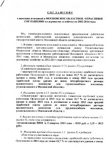 Соглашением предусматривается «поэтапное повышение заработной платы работникам Организаций в 2013 году не менее 11,7% от достигнутого уровня к концу 2012 года и достижение к концу 2013 года средней заработной платы уровня не менее четырёхкратного размера прожиточного минимума для трудоспособного населения, установленного в Московской области. Устанавливается, что минимальным уровнем заработной платы с 1 октября т. г. является заработная плата = 11 тыс. руб. (при соблюдении установленной законодательством продолжительности рабочего времени). Соглашение размещено в разделе НАПРАВЛЕНИЯ ДЕЯТЕЛЬНОСТИ подраздел ЗАЩИТА РАБОТНИКОВ - СОГЛАШЕНИЯ