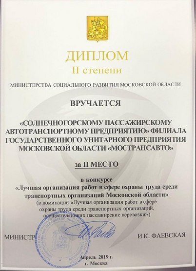 23 мая 2019 года в Министерстве социального развития Московской области состоялась церемония награждения коллективов филиалов ГУП МО "МОСТРАНСАВТО" по итогам Московского областного конкурса "Лучшая организация работ в сфере охраны труда среди транспортных организаций Московской области" в номинации "Лучшая организация работ в сфере охраны труда среди транспортных организаций, осуществляющих пассажирские перевозки":