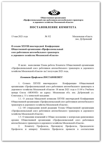 Постановление комитета № 3/2 "О созыве XXVIII внеочередной Конференции Общественной организации "Профессиональный союз работников автомобильного транспорта и дорожного хозяйства Московской области" от 13 мая 2021 г.