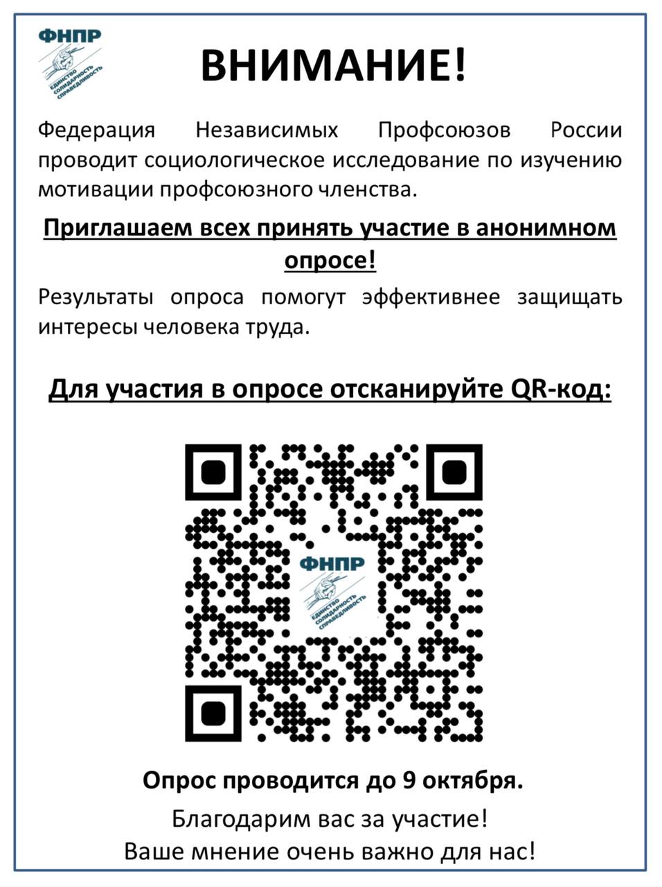 Уважаемые подписчики, предлагаем принять участие в социологическом исследовании по изучению мотивации профсоюзного членства, которое проводит Федерация Независимых Профсоюзов России.