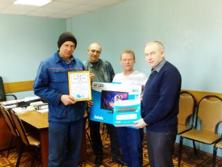 1 место: Древалю Дмитрию Михайловичу, уполномоченному по охране труда профкома, слесарю-ремонтнику «Автоколонны 1796» филиал ГУП МО «МОСТРАНСАВТО» (вручение диплома и памятных подарков Древалю Д.М. /крайний слева/ производит гл. технический инспектор труда профсоюза Н.Н. Пирогов);